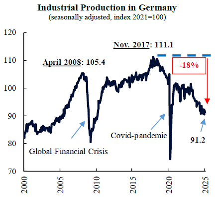 Third, the manufacturing sector, a key sector of the German economy, continues to extend a sustained period of decline that drags on overall growth. Between 2000 and the peak in 2017, the industrial component of real GDP grew at an annual rate of 1.9%. This robust pace reversed dramatically afterwards, as the sector faced a successive series of negative shocks, including global trade tensions, a slowing world economy, the Covid-pandemic, the energy crisis due to the Russo-Ukrainian war, and the decline of the automotive industry. Since its peak in 2017, industrial production accumulates a contraction of 18% in Germany.