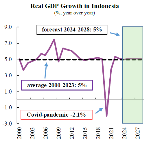 في العقود الأخيرة، برزت منطقة جنوب شرق آسيا كواحدة من أكثر المناطق حيوية في العالم، فهي تضم بعضاً من أسرع الاقتصادات نمواً. وتشمل مجموعة الدول هذه إندونيسيا، رابع أكبر دولة في العالم من حيث عدد السكان. خلال الفترة 2000-2023، بلغ متوسط معدل النمو الاقتصادي لمنطقة جنوب آسيا 5%. واستمر هذا الأداء اللافت خلال فترات مليئة بالتحديات، بما في ذلك السنوات التي اتسمت بتقلبات كبيرة إبان الأزمة المالية العالمية، وأزمة الديون السيادية الأوروبية، وجائحة كوفيد-19. علاوة على ذلك، تم تجاوز تلك العقبات باستقرار ملحوظ، حيث تراجع النمو إلى ما دون 4% خلال ثلاث سنوات فقط.